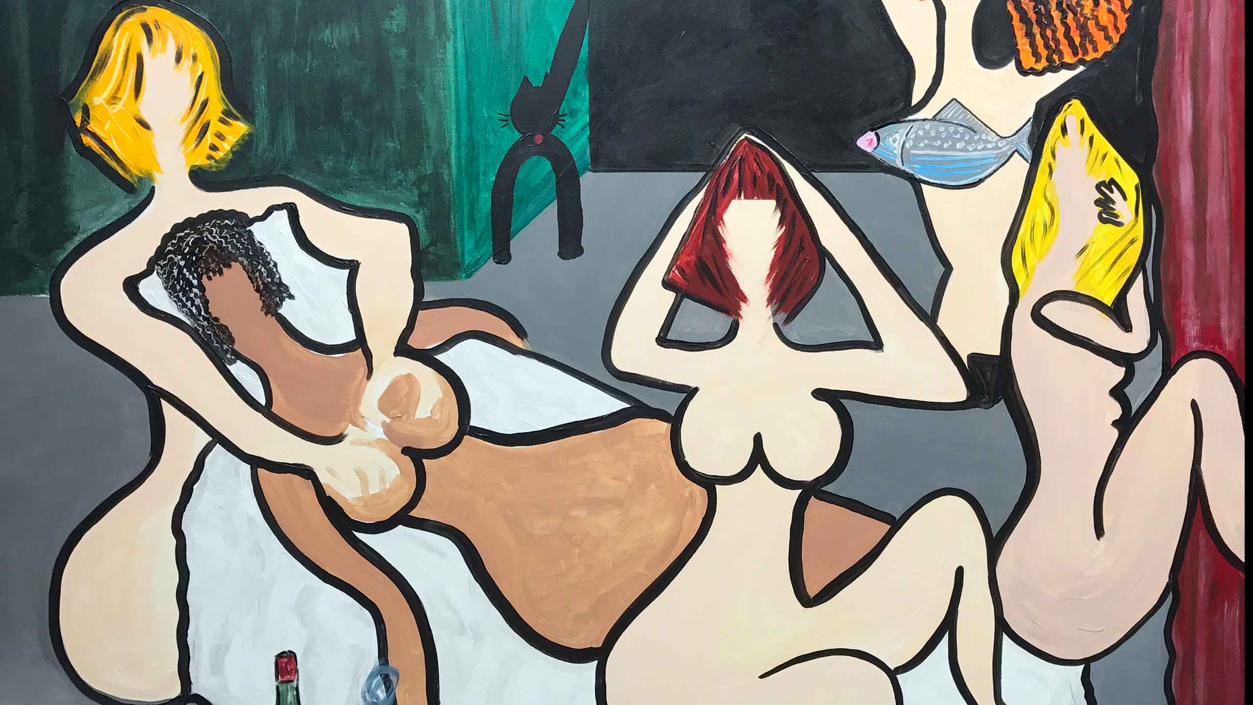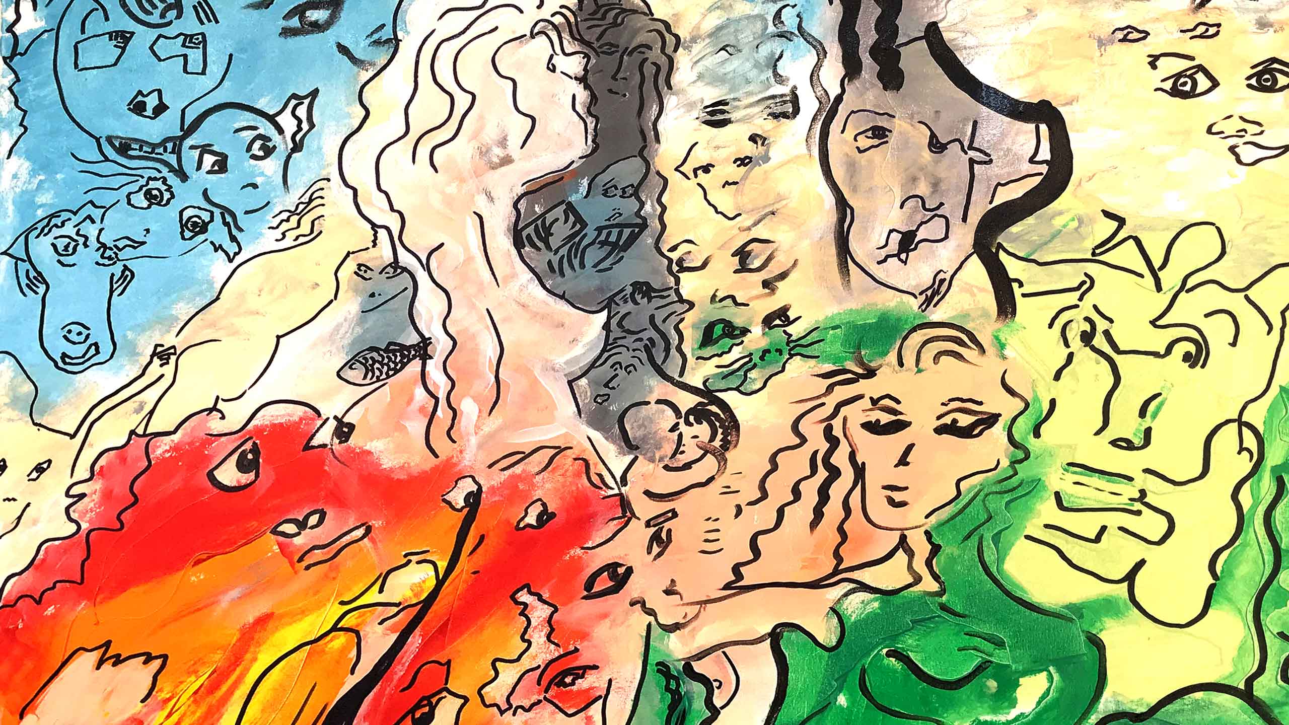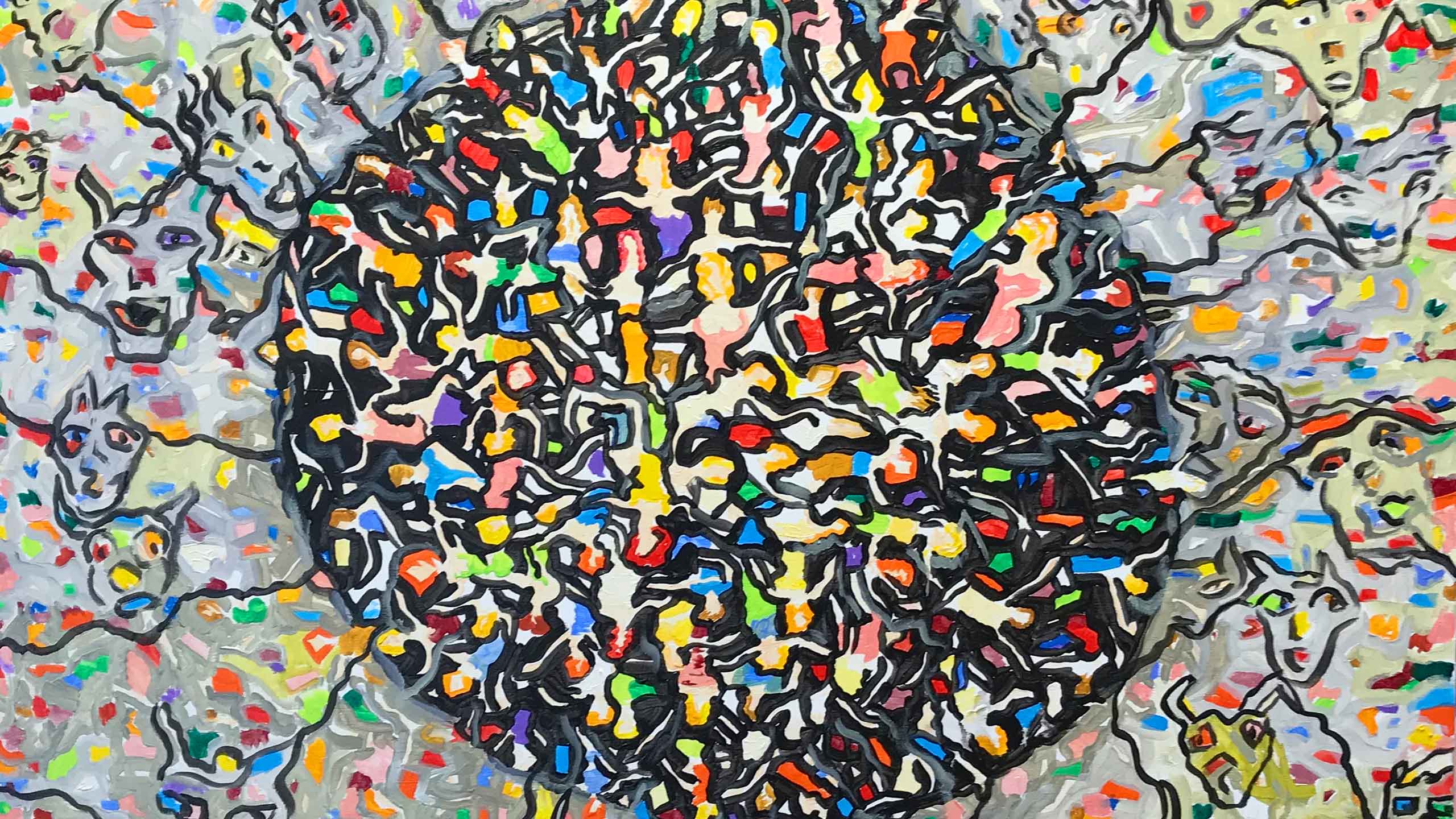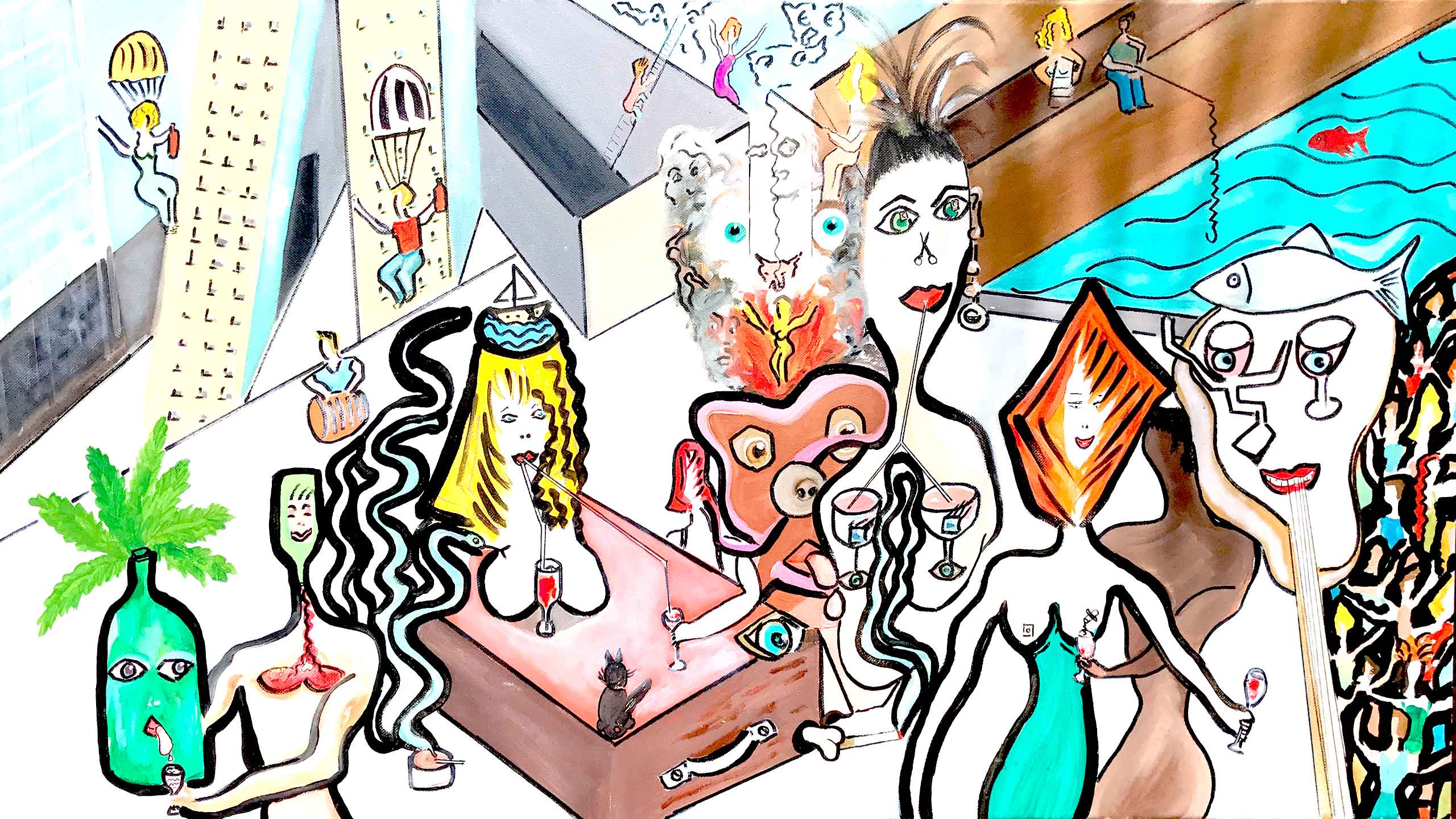 L’idée globale est là, et le tableau se construit le pinceau à la main, de manière peut-être plus instinctive que réfléchie. Cela ne veut pas dire que les idées de construction, de sens général n’y sont pas, mais le peintre cherche néanmoins quelque chose de relativement rapide, qui corresponde à une réflexion ou une sensation du moment. La spontanéité va avec une certaine rapidité d’exécution, et une volonté de ne pas lécher trop les toiles : les silhouettes sont souvent esquissées, les proportions sont quelque fois revisitées, la peinture est davantage posée que empâtée, mais tout cela participe à un univers général où le geste fait partie de l’œuvre en construction. Nous sommes dans une peinture abstraite, mais qui par certains côtés répond à l’action painting d’un Jackson Pollock : il s’agit de projeter ses gestes sur la toile, rapidement, pour correspondre à un état mental d’un moment donné. Il ne s’agit pas d’évoquer le monde réel, avec un respect de règles académiques précises, mais davantage de rendre accessible une vision ou une conception du monde dans une démarche plus d’interprétation.