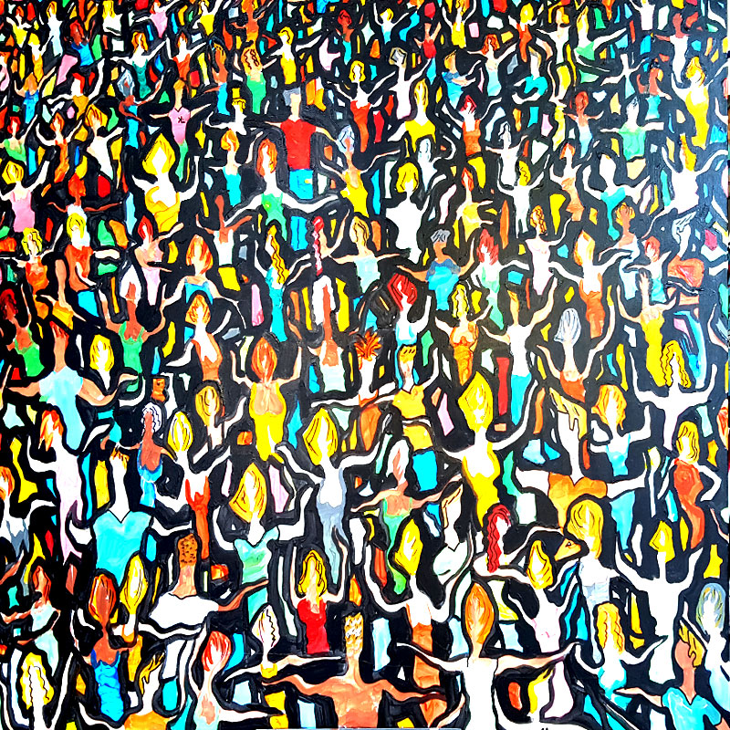 Jean Vallon peint ici et convoque dans sa toile toute une culture qui puise dans un corpus très large de religions.