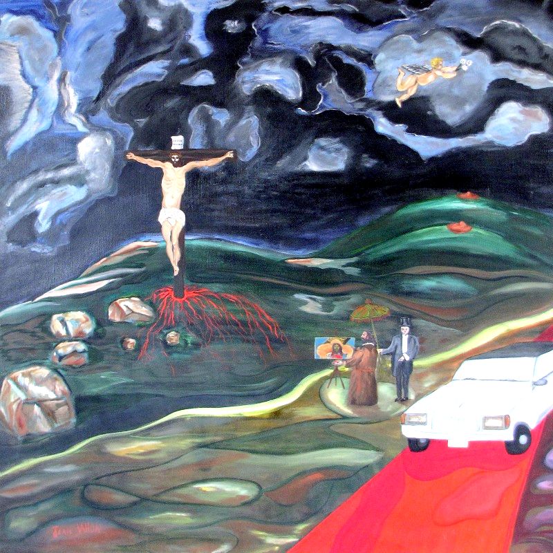 Le thème avait déjà retenu son attention en 1989, dans Sectes et religions, où un homme et les larrons étaient crucifiés sur une colline, mais entourés de silhouettes et de titres de journaux qui apparaissaient en filigrane dans le fond du tableau. La scène est intemporelle, comme peut l’être tout discours sur la fin des temps. Cette « eschatologie cosmique », cette pensée qui interroge la destinée du genre humain n’est pas propre à une culture ou une époque. Elle interroge tout homme, à toute époque, toutes sectes comme toutes religions, monothéiste ou non, révélée ou non. « Symboliquement, précise le peintre, je reprojette le divin que je ne reconnais pas en moi sur des éléments extérieurs ». Ce n’est pas plus simple, mais cela permet d’objectiver les interrogations que tout le monde peut avoir.