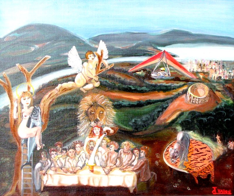 C’est encore plus net, la même année, dans Le départ de l’ère du poisson arrivée à l’ère du ver- seau, la nouvelle cène (1994). Les symboles ont cette fois-ci tout envahi. Par l’entrée symboliste, on finit par retomber sur les tableaux faits dix ans plus tôt dans une veine plus surréaliste : une toile remplie de petites scènes, encombrée de références, un trop-plein de sens qui finit par créer une fusion entre tous les lieux, les époques, les personnages : certains y verront la Bible présente à travers la cène, même si le peintre guide le spectateur vers une autre dimension grâce au titre qui évoque clairement l’axe Poisson/Vierge, remplacé par l’axe Verseau/Lion : on passe d’une civili- sation à une autre. Le monde antique n’est pas oublié, avec au loin cette ville imprécise, mais qui pourrait être la capitale de l’Empire romain avec son Colysée, et tout cela est survolé par un homme qui ne peut appartenir qu’à l’époque actuelle, accroché à son ULM… Et il faudrait encore évoquer le lion qui domine la scène, ou la bête qui a retourné sa peau et montre que toute transformation est toujours possible … Des mammifères, qui contrastent avec le poisson, présenté d’ailleurs ici comme étant quasiment dans les airs…