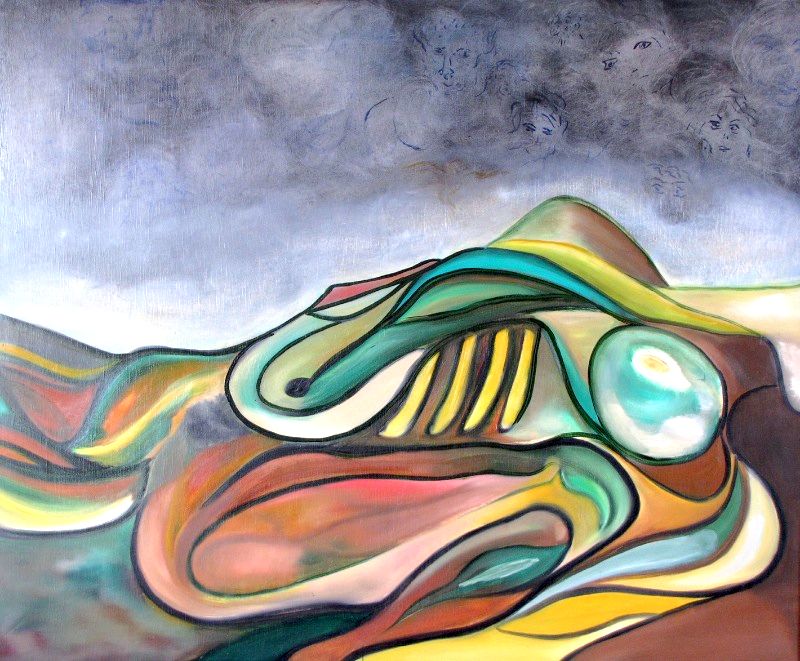 La femme est partout présente, au point parfois d’envahir les paysages. Le peintre commence à peindre un paysage, et c’est une femme qui le compose. Dans Rêve phallique, (1994), malgré le titre, ce n’est pas le pouvoir masculin qui compte : l’homme a des dimensions tellement réduites que son combat avec le taureau semble anecdotique. D’ailleurs, il est doté d’ailes comme s’il pou- vait toujours fuir si cela se passait mal… C’est un homme-torero-angelot qui finit par ne plus avoir grande importance… De toute façon, au fond de ce paysage, la femme-montagne dort… indiffé- rente au sort de l’homme sur qui pourtant une force inconnue essaie de braquer les projecteurs… Dans ce tableau, la femme est clairement représentée. Elle se fond parfois plus dans le paysage, comme une matrice qui reste liée à la terre. C’est le cas de toute une série de tableaux réalisés en 1994-95 : L’attachement (1994), Civilisation née de la terre (1994), Fécondité (1995), Matrice recherche d’absolu (1995). Dans l’attachement, les arrondis des collines évoquent évidemment des formes féminines, les verts chauds et variés montrent une terre fertile, riche, et les corps enlacés forment des arabesques toujours bien ancrés dans le sol. Dans Matrice recherche d’absolu, la femme est présente sous terre, mais elle est alors la source de nombreuses vies, elle est peuplée de tas de créatures en devenir. Au contraire, une fois sur terre, elle se fond encore en partie dans le pay- sage, mais sans toutes ses silhouettes qui l’habitaient. Elle est là pour elle-même, apaisée, partie intégrante du paysage.