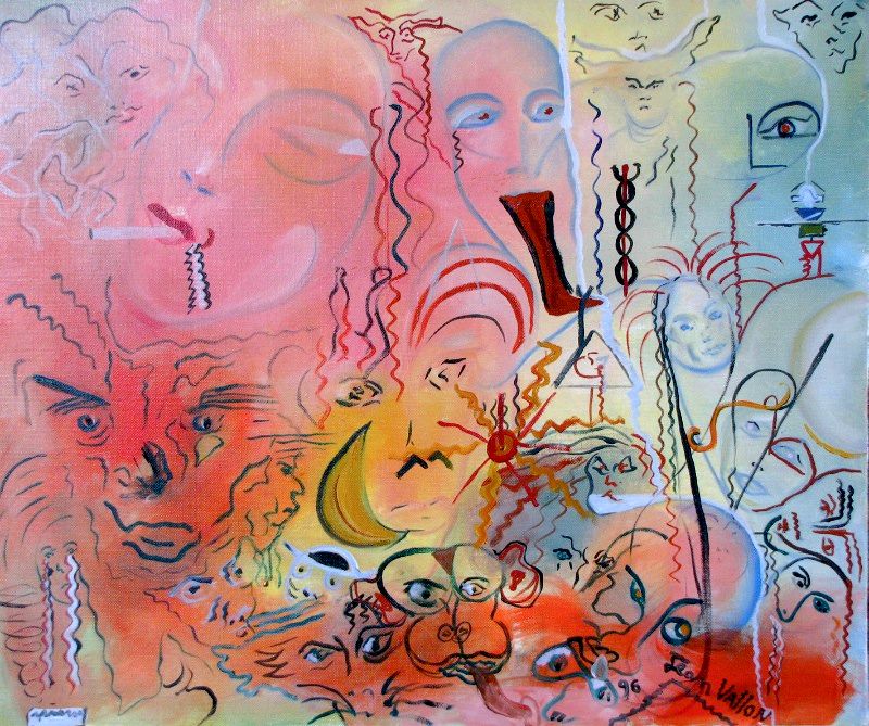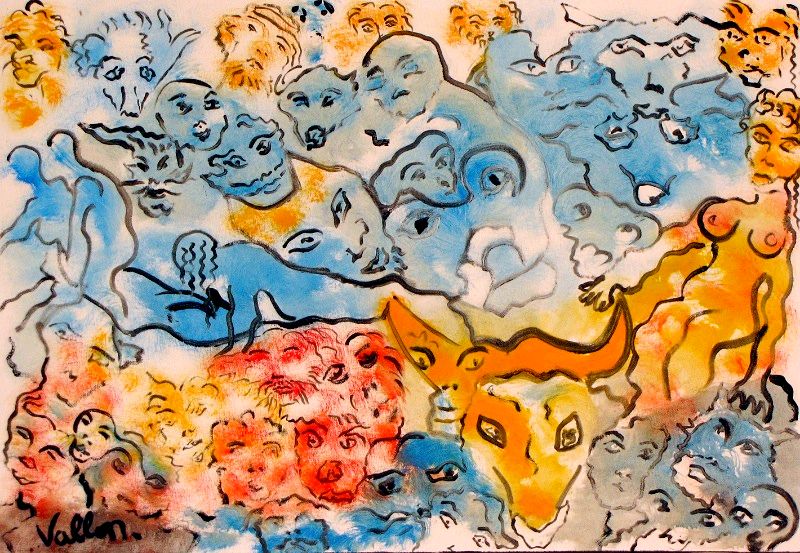 Jean Vallon n’a pas repris ces titres, car son petit monde à lui, ce qu’il appelle le « non mani- festé » ne constitue pas (du moins dans un premier temps) l’objet principal de ses tableaux. Mais il n’empêche : tout un cortège de créatures peuple de nombreuses toiles.