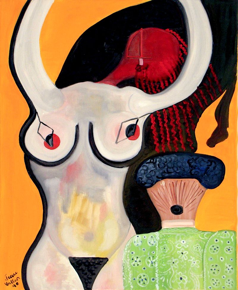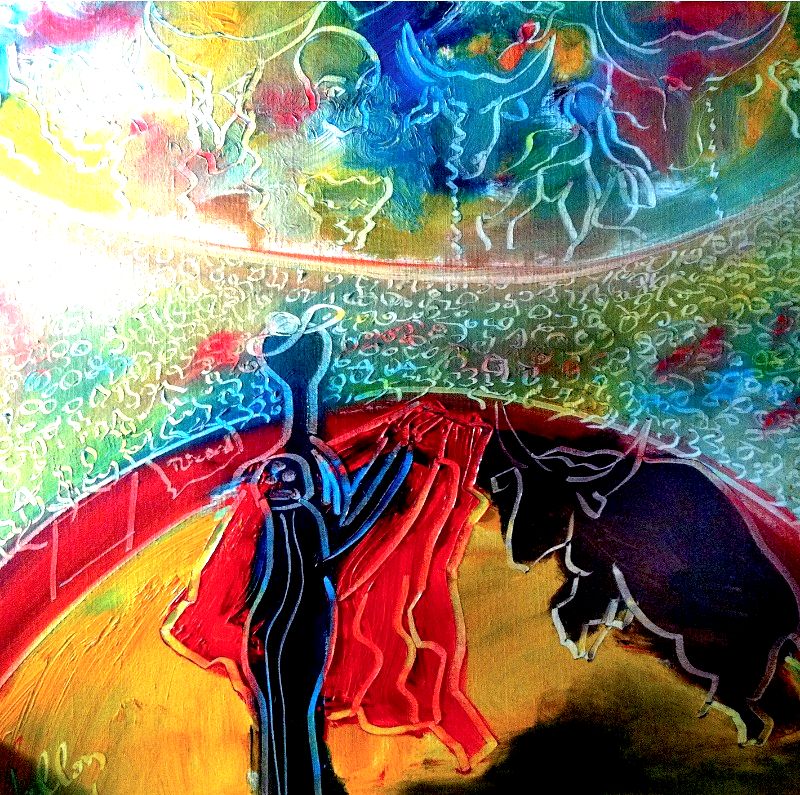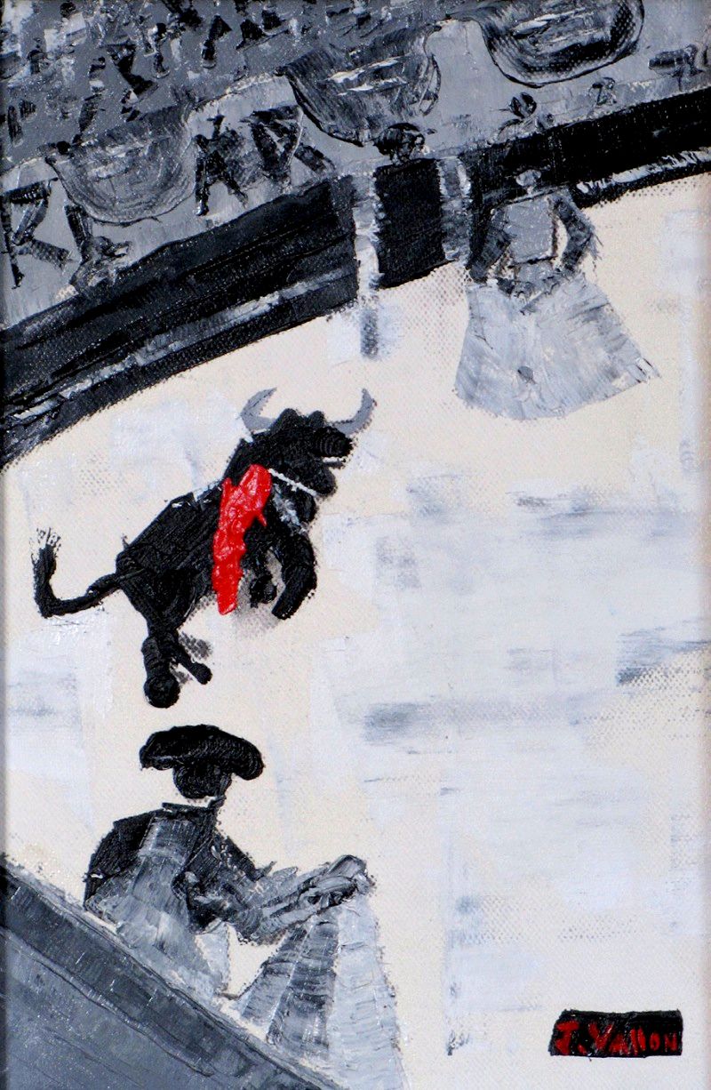 Et parfois, tout cela s’emmêle, les visions se surimposant les unes aux autres. Dans La vision refoulée du torero, 1996, Jean Vallon ne distingue plus le taureau de la femme, et le torero de dos pourrait bien être le peintre lui-même qui contemple quelque chose de stylisé, un corps féminin si l’on s’en tient au premier plan, une ombre beaucoup plus inquiétante si l’on prend en compte le rouge et le noir du taureau blessé dans l’arène.