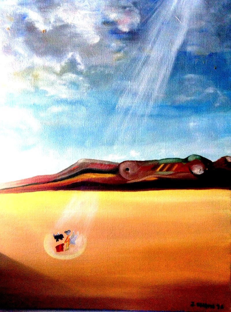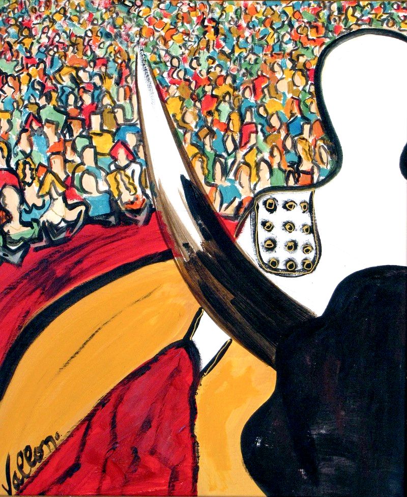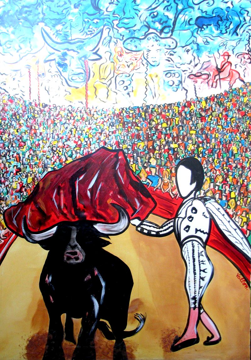 Ce n’est pas la seule façon que Jean Vallon a trouvé pour prendre de la distance avec son sujet. Dans d’autres toiles, on voit bien qu’il se passe autant de choses dans l’arène ou dans les gradins que dans le ciel (Sol y sombra, 2000 ; El Derechazo, 2002). Cette présence du « non manifesté » qui n’est pas spécifique au monde de la corrida dans l’œuvre du peintre, prend ici un sens particulier : elle tend à rassembler tous les acteurs de la scène. Dans le ciel, des hommes qui ont peur, un torero passif, un taureau qui pleure… Le regard se déplace, Jean Vallon ne peint pas la destinée tragique du taureau, l’angoisse des aficionados ou la peur du torero (pourtant bien visible dans El Derechazo, ou le torero est blanc comme un linge…). Il mélange tout cela pour montrer que l’intérêt de la corrida tient dans tout cela à la fois.