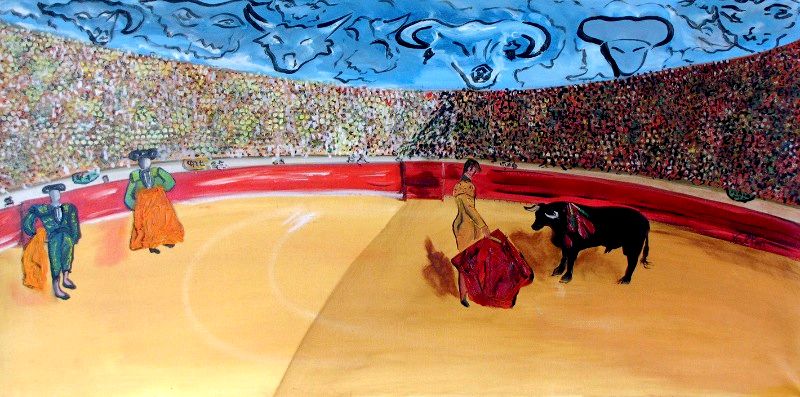 Petit à petit, ce thème va évoluer, en allant vers une stylisation toujours plus poussée. Dans les Arènes de Nîmes, tout se chevauche : cinq taureaux, cinq toreros, des chevaux, des picadors occupent les arènes, mais restent finalement au second plan, derrière une évocation rapide mais centrale d’une Pieta. La foule a donc beaucoup de choses à se mettre sous les yeux. Celui qui re- garde le tableau en a encore davantage, puisque toute cette scène est elle-même bordée d’une frise composée de symboles qui montrent des taureaux épurés, des taureaux qui renvoient aussi bien à la grotte de Lascaux qu’à l’invention d’un Picasso réalisant un taureau avec une selle et un guidon de vélo. La corrida devient alors une porte d’entrée pour un univers fait de soleil, de mysticisme, d’inventivité, un univers qui renvoie à une histoire plus que millénaire.